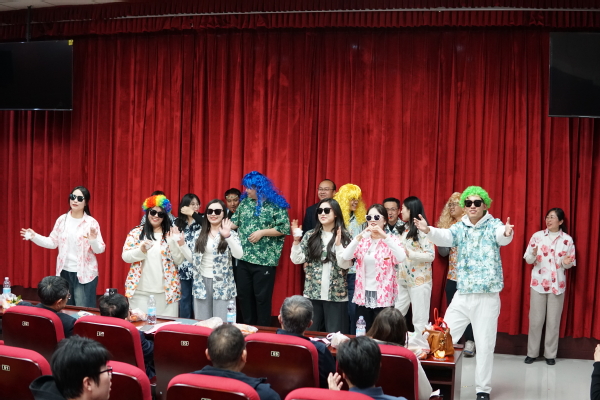 随着灯光渐亮,红幅高挂,中文系教师表演的合唱《敢问路在何方》拉开了联欢会的序幕,表演展现了中文系全体教师勇于探索未知,敢于面对困难,在充满机遇与挑战的征途上大步前行的精神风貌。紧接着,美术系教师表演的《金龙腾飞,金蛇狂舞——创意歌曲秀》为大家送上新年最诚挚的期盼和祝福,现场观众被别出心裁的表演深深吸引。音乐系教师以2024年最流行的舞姿《APT》闪亮登场,昂扬激情的鼓点瞬间将现场的气氛点燃。法学系教师带来的三句半《MC法学天团》以诙谐幽默的形式展示了法学系教辅工作的日常点滴,赢得了在场教职工的阵阵笑声。最后,院机关教职工的歌曲表演《青苹果乐园》带领大家踏入回忆青春的梦幻之旅,以充满活力的舞姿和真挚的情感将新年的喜庆氛围推向了高潮,为本次联欢会画上了圆满的句号。