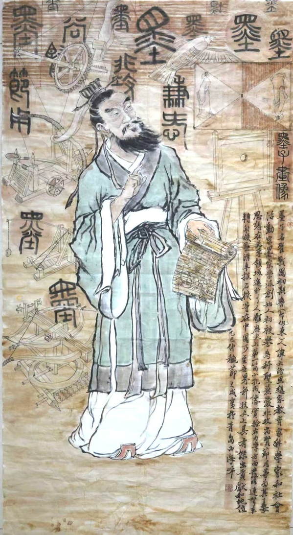 《墨子画像》以春秋战国时期著名科学家、思想家墨子为创作原型,通过国画技法,生动再现了墨子躬身实践、专注研究的形象。作品笔墨凝练,刻画细腻,既传达出墨子“兼爱、非攻”的哲学思想,也展现出其作为古代科学探索者的务实精神。评委评价该作品“以艺术语言跨越时空,实现了历史人物与现代审美的融合”。