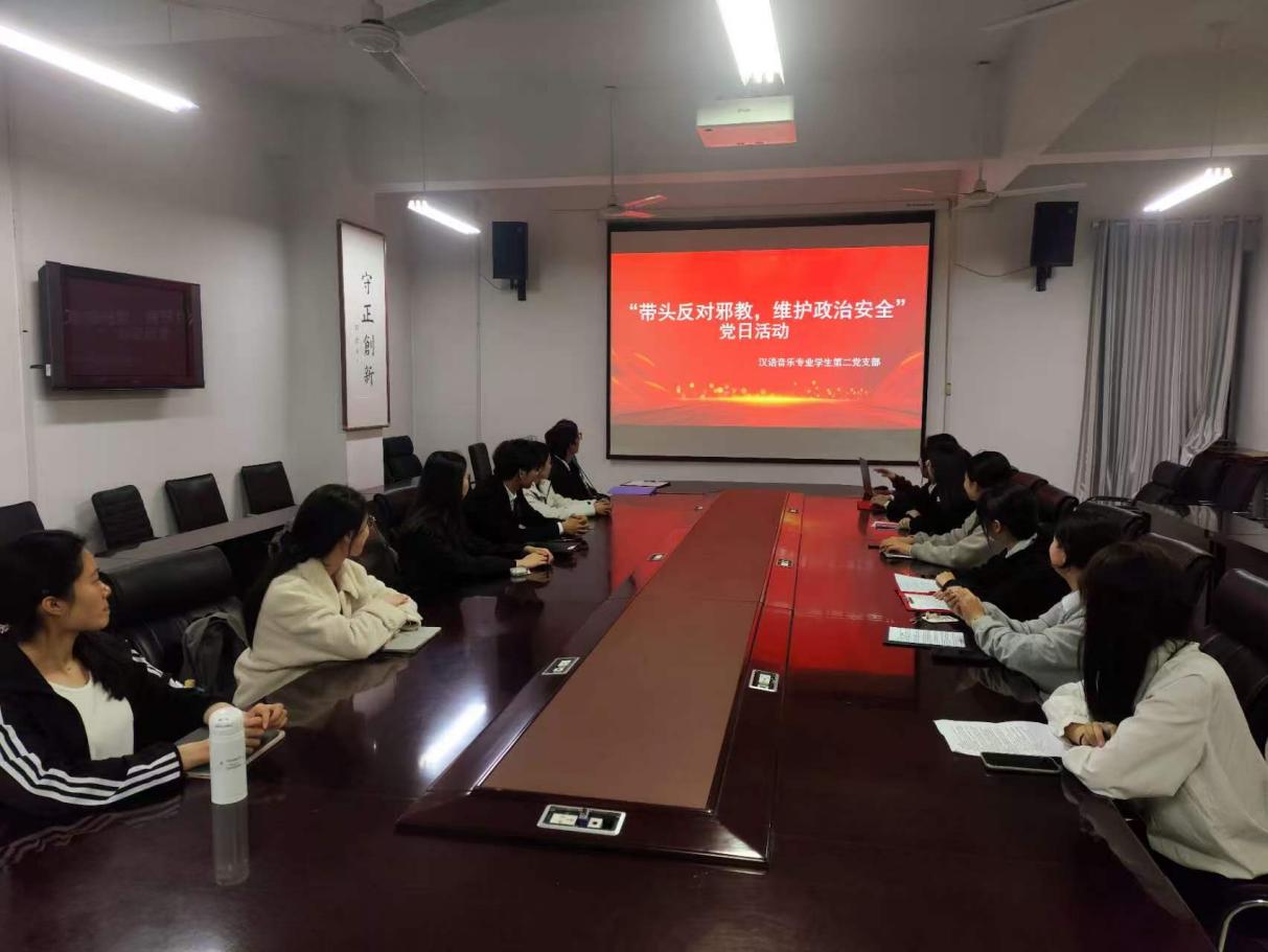 为进一步增强支部党员的反邪教意识,提高防范和抵制邪教的能力,筑牢思想防线,坚定理想信念,4月8日,汉语音乐专业学生第二党支部以 “认清邪教本质 筑牢思想防线” 为主题开展反邪教主题党日活动,引导全体党员树立正确的世界观、人生观、价值观,自觉远离和坚决抵制邪教。全体党员参加活动,党支部书记高文鑫主持活动。